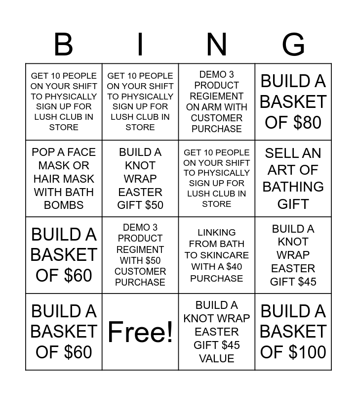 This bingo card has 16 words: Free!, BUILD A KNOT WRAP EASTER GIFT $45, DEMO 3 PRODUCT REGIEMENT ON ARM WITH CUSTOMER PURCHASE, GET 10 PEOPLE ON YOUR SHIFT TO PHYSICALLY SIGN UP FOR LUSH CLUB IN STORE, BUILD A BASKET OF $60, GET 10 PEOPLE ON YOUR SHIFT TO PHYSICALLY SIGN UP FOR LUSH CLUB IN STORE, LINKING FROM BATH TO SKINCARE WITH A $40 PURCHASE, BUILD A KNOT WRAP EASTER GIFT $45 VALUE, POP A FACE MASK OR HAIR MASK WITH BATH BOMBS, BUILD A KNOT WRAP EASTER GIFT $50, BUILD A BASKET OF $60, BUILD A BASKET OF $80, DEMO 3 PRODUCT REGIMENT WITH $50 CUSTOMER PURCHASE, SELL AN ART OF BATHING GIFT, GET 10 PEOPLE ON YOUR SHIFT TO PHYSICALLY SIGN UP FOR LUSH CLUB IN STORE and BUILD A BASKET OF $100.