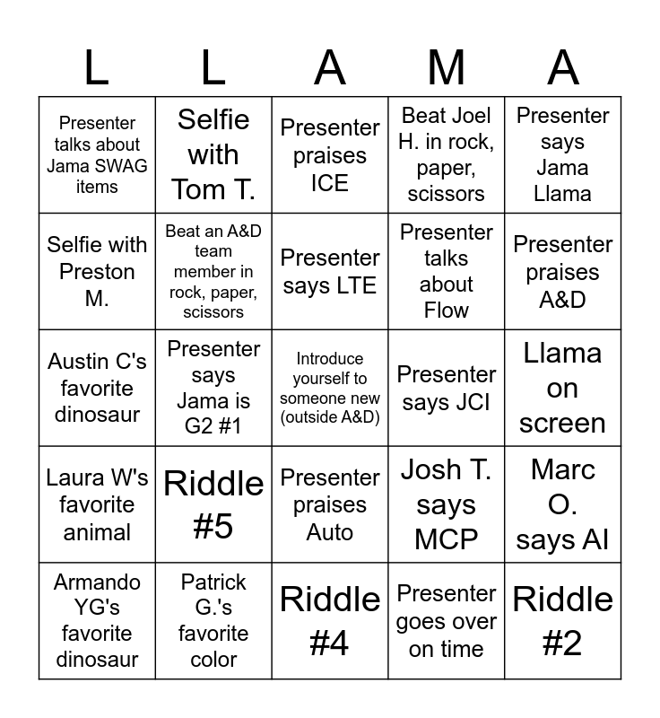 This bingo card has a free space and 50 words: Riddle #1, Riddle #2, Riddle #3, Riddle #4, Riddle #5, Selfie with Marc O., Selfie with Tom T., Selfie with Jim D., Selfie with Preston M., Selfie with Matt Macias, Beat an A&D team member in rock, paper, scissors, Beat Joel H. in rock, paper, scissors, Marc O. says AI, Josh T. says MCP, Presenter says LLM, Presenter says Live Traceability, Presenter says LTE, Presenter says JCI, Presenter says Be Bold, Presenter says Jama Llama, Presenter says Jama is G2 #1, Presenter goes over on time, Presenter talks about Jama SWAG items, Presenter talks about Flow, Presenter talks about Polarion, Presenter talks down on DOORS or DNG, Presenter praises A&D, Presenter praises Med, Presenter praises ICE, Presenter praises Auto, Presenter praises Semi, Microphone dies or disconnects, Sound system feedback loop, Patrick K's favorite color, Patrick G.'s favorite color, Matt Mickle's favorite color, Vincent B's favorite color, Zeb's favorite ice cream, Amanda J's last road trip stop, Llama on screen, JCA discussion, Wear A&D Patch for 1 day, Get DJ Dirty Racket's autograph, Bring Jim Rose a cookie, Armando YG's favorite dinosaur, Austin C's favorite dinosaur, Makenna I's favorite dinosaur, Cary B's favorite dinosaur, Laura W's favorite animal and Liam R's favorite animal.