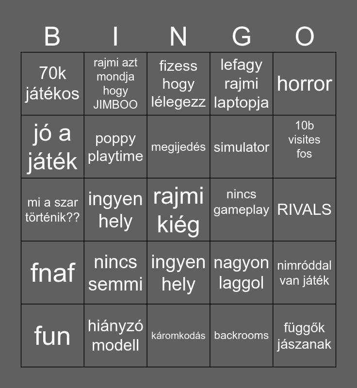 This bingo card has a free space and 24 words: nincs semmi, hiányzó modell, megijedés, fun, horror, 70k játékos, jó a játék, rajmi azt mondja hogy JIMBOO, nincs gameplay, ingyen hely, simulator, mi a szar történik??, nagyon laggol, nimróddal van játék, poppy playtime, backrooms, RIVALS, fizess hogy lélegezz, 10b visites fos, ingyen hely, függők jászanak, fnaf, lefagy rajmi laptopja and káromkodás.