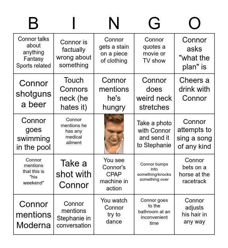 This bingo card has a free space and 24 words: Take a shot with Connor, Connor mentions Stephanie in conversation, Connor mentions he's hungry, Connor mentions Moderna, Connor asks "what the plan" is, Connor talks about anything Fantasy Sports related, Connor shotguns a beer, Connor is factually wrong about something, Take a photo with Connor and send it to Stephanie, You see Connor's CPAP machine in action, Connor does weird neck stretches, Connor goes swimming in the pool, Connor bumps into something/knocks something over, Connor bets on a horse at the racetrack, Touch Connors neck (he hates it), Connor goes to the bathroom at an inconvenient time, Connor attempts to sing a song of any kind, Connor gets a stain on a piece of clothing, Cheers a drink with Connor, Connor mentions he has any medical ailment, Connor adjusts his hair in any way, Connor mentions that this is "his weekend", Connor quotes a movie or TV show and You watch Connor try to dance.