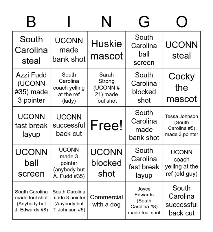 This bingo card has a free space and 24 words: UCONN made 3 pointer (anybody but A. Fudd #35), South Carolina made 3 pointer (Anybody but T. Johnson #5), Sarah Strong (UCONN # 21) made foul shot, South Carolina made foul shot (Anybody but J. Edwards #8), UCONN steal, South Carolina steal, Azzi Fudd (UCONN #35) made 3 pointer, UCONN made bank shot, South Carolina made bank shot, UCONN blocked shot, South Carolina blocked shot, UCONN fast break layup, South Carolina fast break layup, UCONN coach yelling at the ref (old guy), South Carolina coach yelling at the ref (lady), Joyce Edwards (South Carolina #8) made foul shot, Tessa Johnson (South Carolina #5) made 3 pointer, Huskie mascot, Cocky the mascot, UCONN successful back cut, South Carolina successful back cut, UCONN ball screen, South Carolina ball screen and Commercial with a dog.