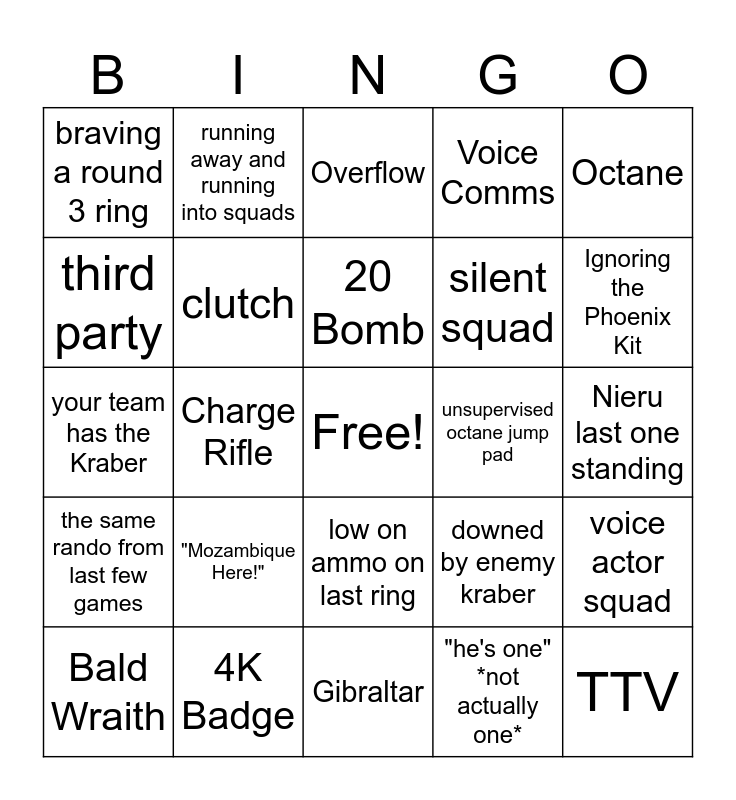 This bingo card has a free space and 24 words: "Mozambique Here!", 4K Badge, 20 Bomb, Bald Wraith, Octane, braving a round 3 ring, third party, running away and running into squads, unsupervised octane jump pad, low on ammo on last ring, silent squad, your team has the Kraber, downed by enemy kraber, voice actor squad, clutch, "he's one" *not actually one*, Nieru last one standing, Overflow, Ignoring the Phoenix Kit, Charge Rifle, TTV, the same rando from last few games, Voice Comms and Gibraltar.