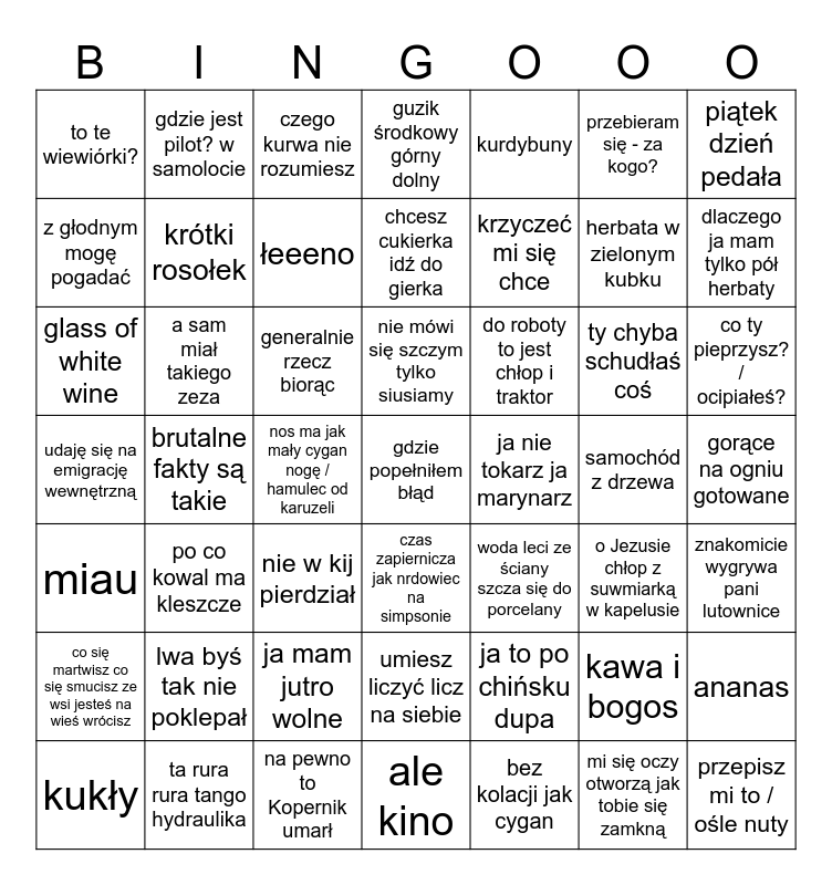 This bingo card has 49 words: kawa i bogos, herbata w zielonym kubku, bez kolacji jak cygan, brutalne fakty są takie, generalnie rzecz biorąc, gorące na ogniu gotowane, gdzie jest pilot? w samolocie, na pewno to Kopernik umarł, przebieram się - za kogo?, czas zapiernicza jak nrdowiec na simpsonie, piątek dzień pedała, guzik środkowy górny dolny, ty chyba schudłaś coś, do roboty to jest chłop i traktor, lwa byś tak nie poklepał, samochód z drzewa, z głodnym mogę pogadać, dlaczego ja mam tylko pół herbaty, ananas, kurdybuny, krzyczeć mi się chce, nos ma jak mały cygan nogę / hamulec od karuzeli, to te wiewiórki?, krótki rosołek, kukły, łeeeno, co ty pieprzysz? / ocipiałeś?, ta rura rura tango hydraulika, nie mówi się szczym tylko siusiamy, a sam miał takiego zeza, przepisz mi to / ośle nuty, ja nie tokarz ja marynarz, co się martwisz co się smucisz ze wsi jesteś na wieś wrócisz, ja mam jutro wolne, udaję się na emigrację wewnętrzną, woda leci ze ściany szcza się do porcelany, o Jezusie chłop z suwmiarką w kapelusie, znakomicie wygrywa pani lutownice, glass of white wine, nie w kij pierdział, umiesz liczyć licz na siebie, miau, gdzie popełniłem błąd, ale kino, chcesz cukierka idź do gierka, czego kurwa nie rozumiesz, ja to po chińsku dupa, po co kowal ma kleszcze and mi się oczy otworzą jak tobie się zamkną.