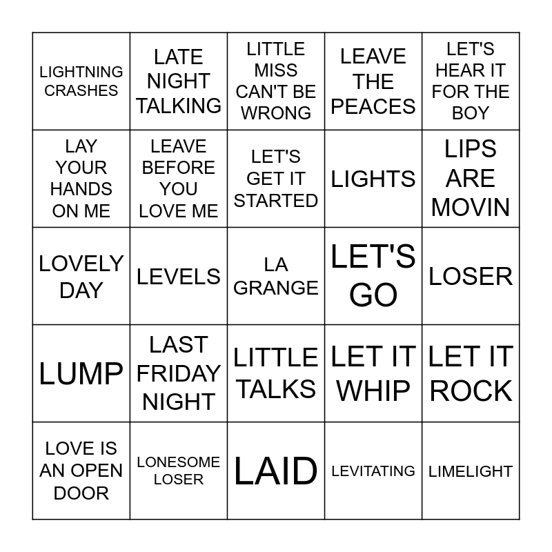 This bingo card has 50 words: LA BAMBA, LA GRANGE, LADY, LAID, LAST FRIDAY NIGHT, LAST NIGHT, LATE NIGHT TALKING, LAUGHTER IN THE RAIN, LAY YOUR HANDS ON ME, LEAVE (GET OUT), LEAVE BEFORE YOU LOVE ME, LEAVE THE PEACES, LET IT ROCK, LET IT WHIP, LET ME CLEAR MY THROAT, LET THE MUSIC PLAY, LET'S GET IT STARTED, LET'S GO, LET'S GO CRAZY, LET'S HEAR IT FOR THE BOY, LEVELS, LEVITATING, LIGHTNING CRASHES, LIGHTS, LIKE A G6, LIMELIGHT, LIPS ARE MOVIN, LIPS OF AN ANGEL, LITTLE MISS CAN'T BE WRONG, LITTLE TALKS, LIVE YOUR LIFE, LIVIN' LA VIDA LOCA, LOCKED OUT OF HEAVEN, LOLLIPOP, LONESOME LOSER, LOOKIN' FOR LOVE, LOS ANGELES, LOSE CONTROL, LOSE YOURSELF, LOSER, LOSING MY RELIGION, LOST, LOUDER THAN LOVE, LOUIE LOUIE, LOVE IS AN OPEN DOOR, LOVELY DAY, LOW, LUCKY STAR, LUMP and LET'S GROOVE.