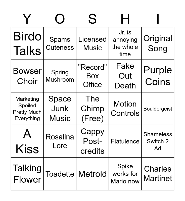 This bingo card has a free space and 24 words: Rosalina Lore, Toadette, "Record" Box Office, Talking Flower, Original Song, Birdo Talks, Bowser Choir, Spams Cuteness, Motion Controls, Cappy Post-credits, Fake Out Death, Marketing Spoiled Pretty Much Everything, Flatulence, Shameless Switch 2 Ad, Spring Mushroom, Spike works for Mario now, Bouldergeist, Licensed Music, Purple Coins, Space Junk Music, Charles Martinet, A Kiss, Jr. is annoying the whole time and Metroid.
