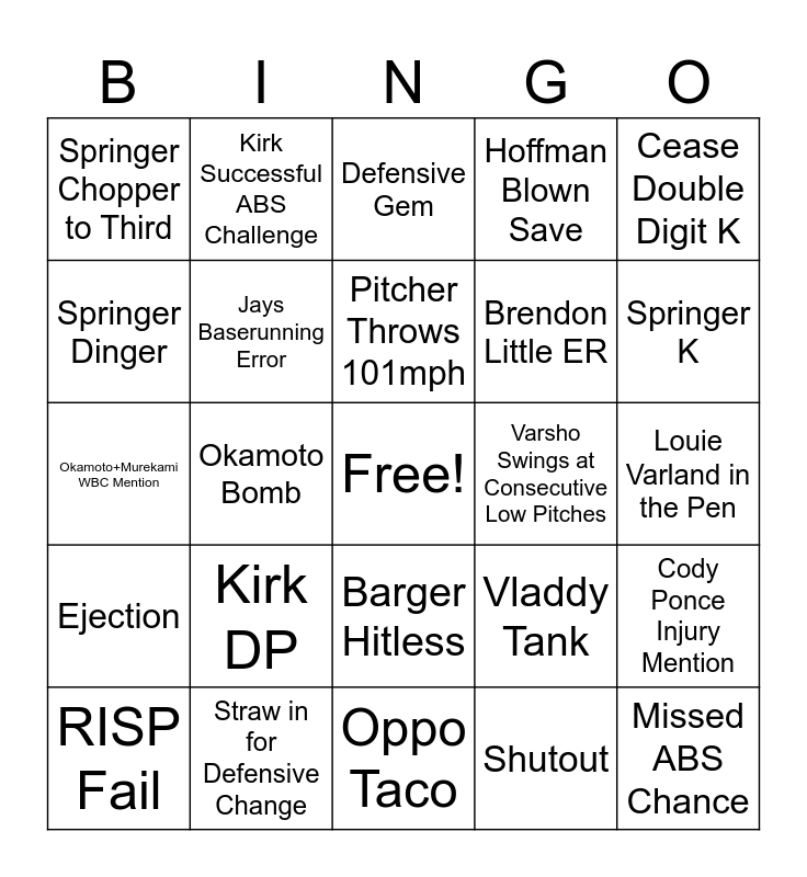 This bingo card has a free space and 24 words: Kirk DP, Straw in for Defensive Change, Pitcher Throws 101mph, RISP Fail, Cease Double Digit K, Springer Chopper to Third, Springer Dinger, Kirk Successful ABS Challenge, Varsho Swings at Consecutive Low Pitches, Barger Hitless, Brendon Little ER, Okamoto+Murekami WBC Mention, Vladdy Tank, Cody Ponce Injury Mention, Jays Baserunning Error, Shutout, Louie Varland in the Pen, Defensive Gem, Springer K, Okamoto Bomb, Missed ABS Chance, Ejection, Hoffman Blown Save and Oppo Taco.