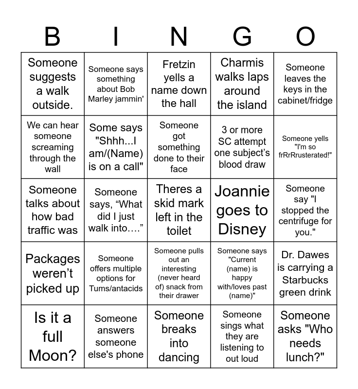 This bingo card has a free space and 44 words: Someone forgets something in the toaster, Someone asks "Who needs lunch?", Someone's patient smells like weed, Is it a full Moon?, Someone mentions getting a margarita before noon, Someone sings what they are listening to out loud, Fretzin yells a name down the hall, Someone yells “hold printing!”, Someone leaves the keys in the cabinet/fridge, Someone answers someone else's phone, Charmis walks laps around the island, Joannie goes to Disney, Someone pulls out an interesting (never heard of) snack from their drawer, Someone offers multiple options for Tums/antacids, Someone asks "does anyone want the rest of my avocado?", Someone breaks into dancing, Somesone yells “IP check”, Someone talks about how bad traffic was, Someone yells "consent check", Someone yells "I'm so frRrRrusterated!", Someone says something about Bob Marley jammin', Someone says “did I get paged”, All prep done for a scheduled screening visit and subject no shows, Someone suggests a walk outside., The centrifuge is beeping, Someone say "I stopped the centrifuge for you.", Observes a co-worker sign for dry ice, Someone says "I hate doing source", Someone says "Current (name) is happy with/loves past (name)", Packages weren’t picked up, Someone can’t find a chart, Dr. Dawes is carrying a Starbucks green drink, Dr. Dawes needs to talk to someone before signing something, Dr. Fretzin goes off topic during a Tuesday morning meeting, Someone says, “What did I just walk into….”, Pager goes off for someone, and they aren’t expecting it (and the patient is here), Front office pages the wrong extension, Someone got their hair done and someone notices, Someone got something done to their face, We can hear someone screaming through the wall, 3 or more SC attempt one subject’s blood draw, Someone quotes a movie, Some says "Shhh...I am/(Name) is on a call" and Someone asks for a piece of gum.