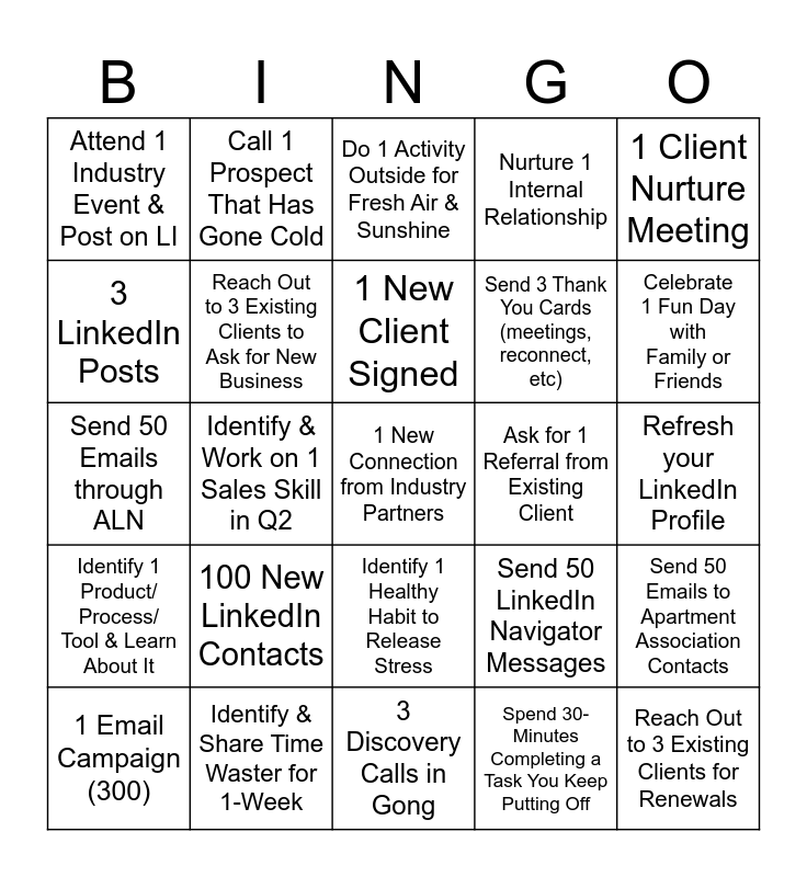 This bingo card has 25 words: 100 New LinkedIn Contacts, 3 Discovery Calls in Gong, 1 New Client Signed, 1 Email Campaign (300), 1 Client Nurture Meeting, Attend 1 Industry Event & Post on LI, 3 LinkedIn Posts, Call 1 Prospect That Has Gone Cold, Ask for 1 Referral from Existing Client, Identify 1 Healthy Habit to Release Stress, Send 3 Thank You Cards (meetings, reconnect, etc), Send 50 Emails through ALN, Send 50 LinkedIn Navigator Messages, Send 50 Emails to Apartment Association Contacts, Reach Out to 3 Existing Clients to Ask for New Business, Reach Out to 3 Existing Clients for Renewals, Refresh your LinkedIn Profile, Do 1 Activity Outside for Fresh Air & Sunshine, Celebrate 1 Fun Day with Family or Friends, Identify & Work on 1 Sales Skill in Q2, 1 New Connection from Industry Partners, Identify & Share Time Waster for 1-Week, Identify 1 Product/ Process/ Tool & Learn About It, Nurture 1 Internal Relationship and Spend 30-Minutes Completing a Task You Keep Putting Off.