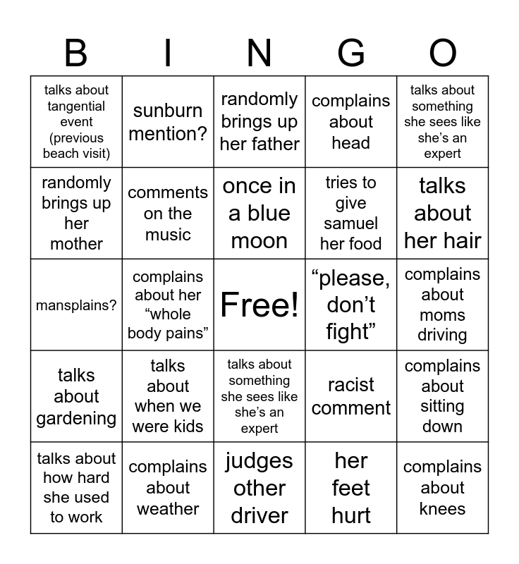This bingo card has a free space and 38 words: “ayy seeheah”, “my other eyes”, makes a comment on samuel, comments on the music, complains about sitting down, talks about when we were kids, once in a blue moon, talks about a documentary, talks about something she sees like she’s an expert, tries to give samuel her food, complains about her “whole body pains”, complains about head, complains about knees, complains about moms driving, randomly brings up her mother, talks about gardening, grandma face, randomly brings up her father, talks about when she was a kid, “please, don’t fight”, talks about tangential event (previous beach visit), complains about weather, talks about her hair, talks about how hard she used to work, judges random stranger, judges other driver, repeats what mom says but wrong, “you kids…”, talks about traffic, talks about random people she knew once, forgets something, talks about something she sees like she’s an expert, her feet hurt, sunburn mention?, can’t hear us, racist comment, mansplains? and wait for her to catch up.