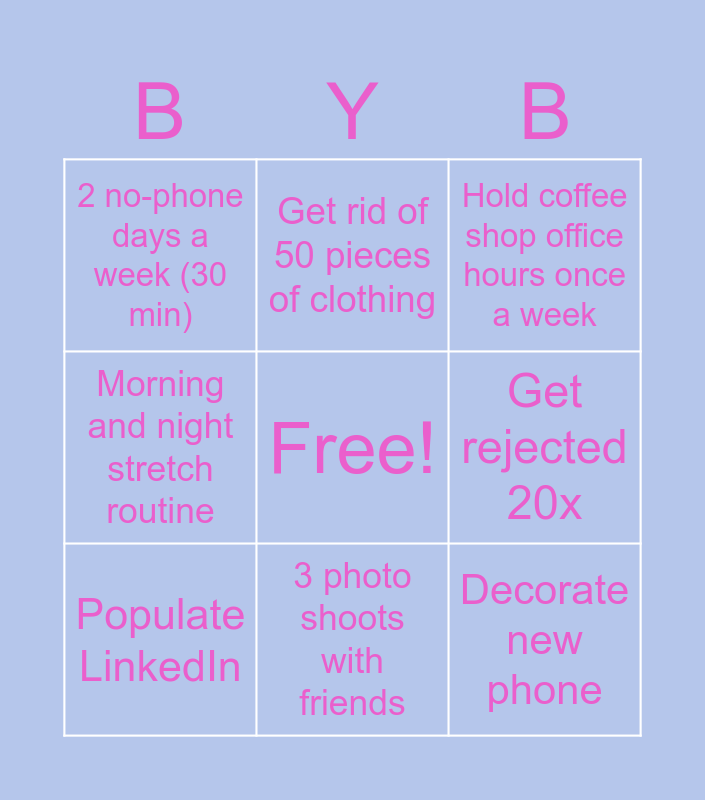 This bingo card has a free space and 8 words: Get rejected 20x, Hold coffee shop office hours once a week, Get rid of 50 pieces of clothing, Populate LinkedIn, 2 no-phone days a week (30 min), Decorate new phone, Morning and night stretch routine and 3 photo shoots with friends.
