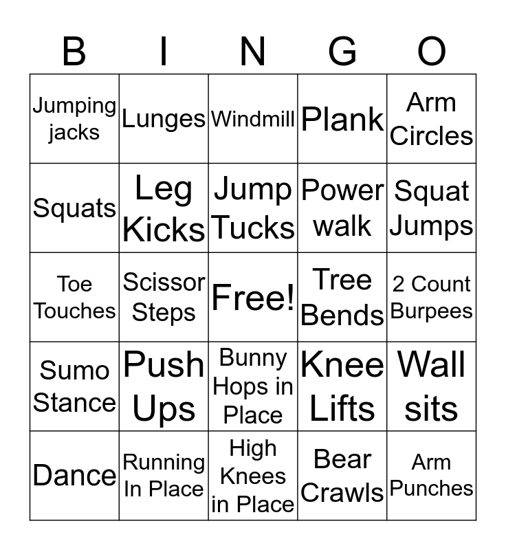 This bingo card has a free space and 24 words: Push Ups, Running In Place, Jump Tucks, Dance, Arm Circles, Jumping jacks, Squats, Lunges, Tree Bends, Bunny Hops in Place, Power walk, Toe Touches, Knee Lifts, Wall sits, Leg Kicks, Bear Crawls, 2 Count Burpees, Windmill, Squat Jumps, Scissor Steps, Arm Punches, Sumo Stance, Plank and High Knees in Place.