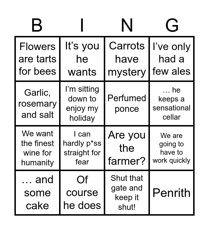 This bingo card has 16 words: Of course he does, We are going to have to work quickly, Carrots have mystery, Flowers are tarts for bees, We want the finest wine for humanity, It’s you he wants, Are you the farmer?, Shut that gate and keep it shut!, Garlic, rosemary and salt, I’m sitting down to enjoy my holiday, … and some cake, I’ve only had a few ales, I can hardly p*ss straight for fear, … he keeps a sensational cellar, Perfumed ponce and Penrith.