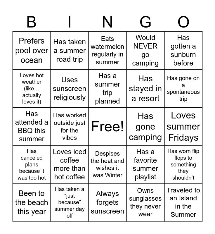 This bingo card has a free space and 24 words: Been to the beach this year, Loves iced coffee more than hot coffee, Has a summer trip planned, Owns sunglasses they never wear, Has gotten a sunburn before, Prefers pool over ocean, Has taken a summer road trip, Eats watermelon regularly in summer, Has gone camping, Loves summer Fridays, Has attended a BBQ this summer, Uses sunscreen religiously, Has a favorite summer playlist, Has worn flip flops to something they shouldn’t, Loves hot weather (like… actually loves it), Has taken a “just because” summer day off, Always forgets sunscreen, Would NEVER go camping, Has gone on a spontaneous trip, Has canceled plans because it was too hot, Has worked outside just for the vibes, Despises the heat and wishes it was Winter, Has stayed in a resort and Traveled to an Island in the Summer.