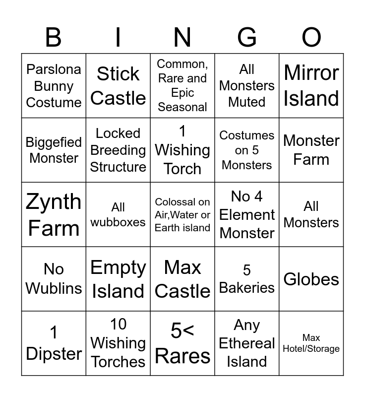 This bingo card has 25 words: No Wublins, 10 Wishing Torches, Colossal on Air,Water or Earth island, Any Ethereal Island, Mirror Island, Parslona Bunny Costume, Stick Castle, Common, Rare and Epic Seasonal, No 4 Element Monster, Globes, Biggefied Monster, Locked Breeding Structure, 5< Rares, 5 Bakeries, Monster Farm, 1 Dipster, All wubboxes, 1 Wishing Torch, Costumes on 5 Monsters, All Monsters, Zynth Farm, Empty Island, Max Castle, All Monsters Muted and Max Hotel/Storage.