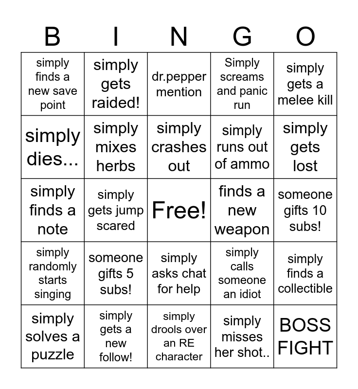 This bingo card has a free space and 24 words: someone gifts 5 subs!, simply gets a new follow!, simply crashes out, simply solves a puzzle, simply gets a melee kill, simply finds a new save point, simply dies..., simply gets raided!, finds a new weapon, simply asks chat for help, simply runs out of ammo, simply finds a note, simply calls someone an idiot, simply finds a collectible, simply mixes herbs, simply misses her shot.., someone gifts 10 subs!, dr.pepper mention, simply gets lost, simply gets jump scared, BOSS FIGHT, simply randomly starts singing, Simply screams and panic run and simply drools over an RE character.