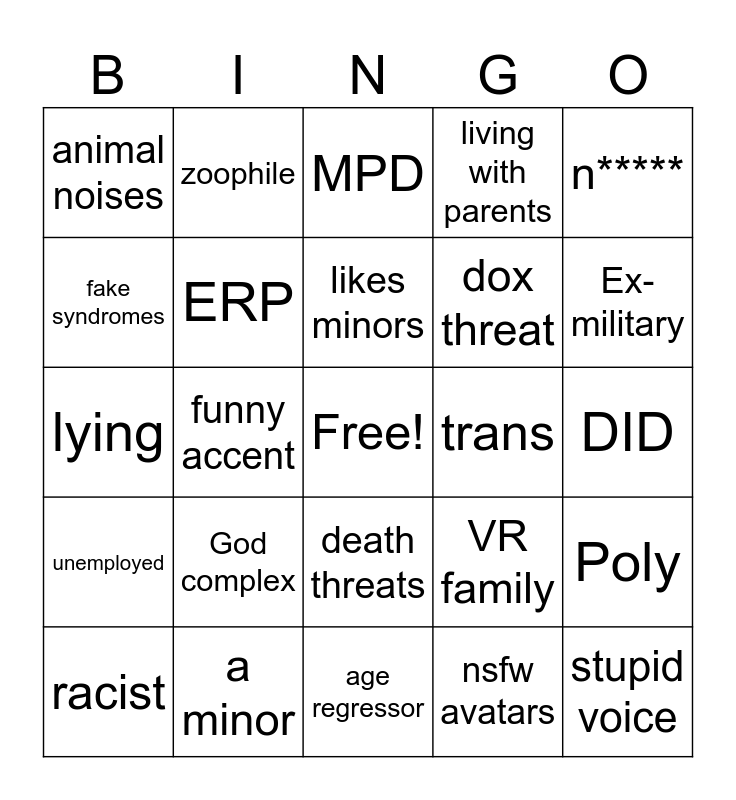 This bingo card has a free space and 24 words: God complex, a minor, likes minors, racist, n*****, animal noises, fake syndromes, zoophile, trans, death threats, dox threat, lying, VR family, Poly, ERP, nsfw avatars, DID, MPD, Ex-military, funny accent, stupid voice, unemployed, living with parents and age regressor.