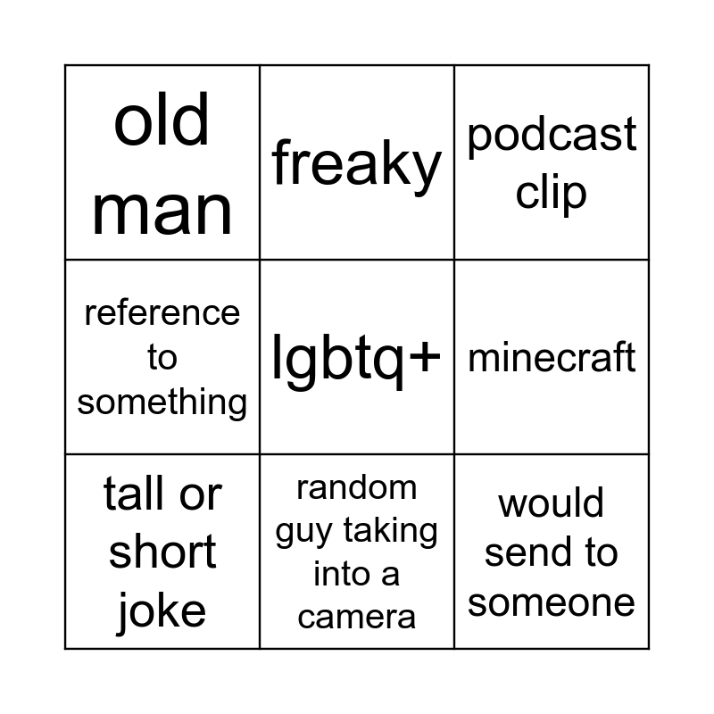 This bingo card has a free space and 11 words: 67, random guy taking into a camera, would send to someone, tall or short joke, freaky, podcast clip, minecraft, makes us laugh, reference to something, old man and freaky.