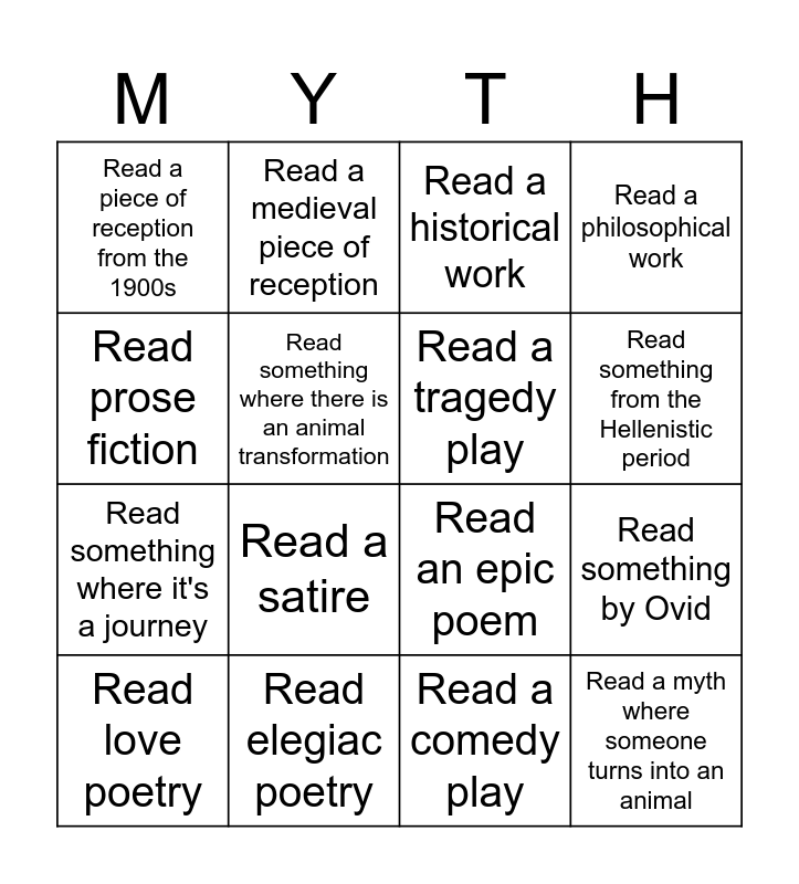 This bingo card has 17 words: Read a comedy play, Read love poetry, Read a historical work, Read a piece of reception from the 1900s, Read a satire, Read a philosophical work, Read something by Ovid, Read a tragedy play, Read something from the Hellenistic period, Read something where there is an animal transformation, Read elegiac poetry, Read an epic poem, Read prose fiction, Read a medieval piece of reception, Read something where it's a journey, Read something from a place conquered by Greek/Rome and Read a myth where someone turns into an animal.
