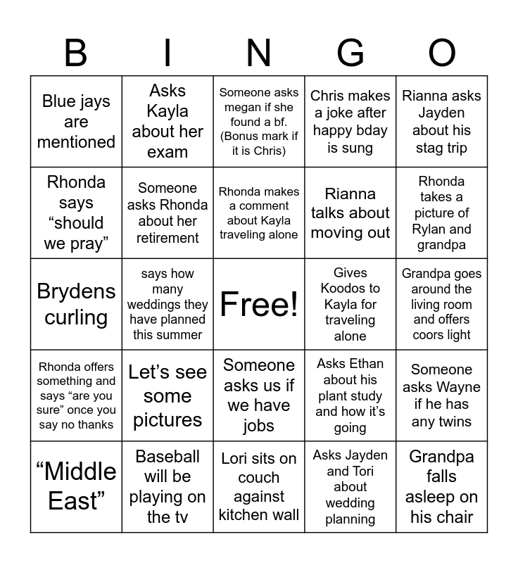 This bingo card has a free space and 24 words: “Middle East”, Let’s see some pictures, Rhonda makes a comment about Kayla traveling alone, Asks Jayden and Tori about wedding planning, Rianna asks Jayden about his stag trip, Blue jays are mentioned, Asks Kayla about her exam, Someone asks megan if she found a bf. (Bonus mark if it is Chris), Gives Koodos to Kayla for traveling alone, Grandpa goes around the living room and offers coors light, Brydens curling, Someone asks Rhonda about her retirement, Asks Ethan about his plant study and how it’s going, Someone asks Wayne if he has any twins, Rhonda says “should we pray”, Baseball will be playing on the tv, Lori sits on couch against kitchen wall, Chris makes a joke after happy bday is sung, Rhonda takes a picture of Rylan and grandpa, Rhonda offers something and says “are you sure” once you say no thanks, says how many weddings they have planned this summer, Someone asks us if we have jobs, Rianna talks about moving out and Grandpa falls asleep on his chair.