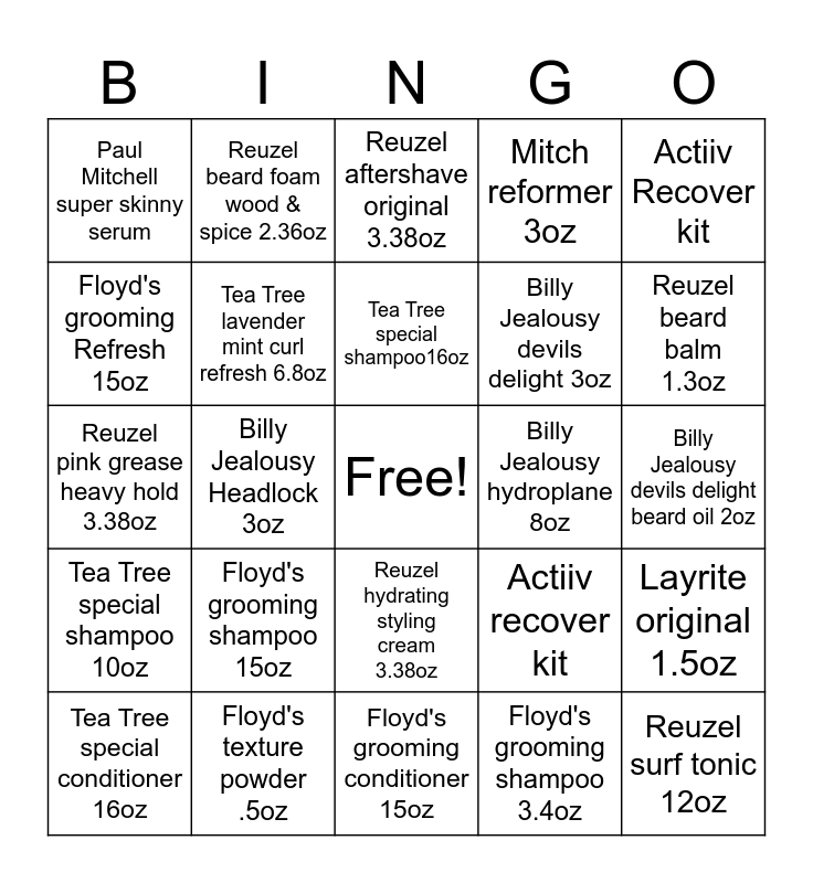 This bingo card has a free space and 25 words: Floyd's grooming shampoo 15oz, Floyd's grooming conditioner 15oz, Tea Tree special shampoo16oz, Tea Tree special conditioner 16oz, Actiiv Recover kit, Paul Mitchell super skinny serum, Floyd's grooming Refresh 15oz, Reuzel beard foam wood & spice 2.36oz, Billy Jealousy hydroplane 8oz, Reuzel hydrating styling cream 3.38oz, Billy Jealousy devils delight 3oz, Reuzel pink grease heavy hold 3.38oz, Actiiv recover kit, Layrite original 1.5oz, Tea Tree lavender mint curl refresh 6.8oz, Layrite concentrated beard oil 2oz, Billy Jealousy devils delight beard oil 2oz, Reuzel aftershave original 3.38oz, Reuzel beard balm 1.3oz, Billy Jealousy Headlock 3oz, Reuzel surf tonic 12oz, Floyd's texture powder .5oz, Tea Tree special shampoo 10oz, Mitch reformer 3oz and Floyd's grooming shampoo 3.4oz.