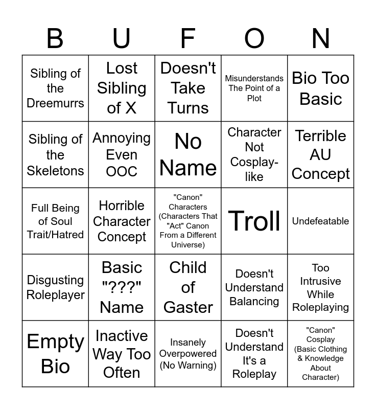 This bingo card has 25 words: Basic "???" Name, Insanely Overpowered (No Warning), No Name, Empty Bio, Bio Too Basic, Sibling of the Dreemurrs, Sibling of the Skeletons, Lost Sibling of X, Troll, Child of Gaster, Character Not Cosplay-like, Full Being of Soul Trait/Hatred, Doesn't Understand Balancing, Too Intrusive While Roleplaying, Annoying Even OOC, "Canon" Cosplay (Basic Clothing & Knowledge About Character), Undefeatable, Doesn't Take Turns, Terrible AU Concept, Horrible Character Concept, "Canon" Characters (Characters That "Act" Canon From a Different Universe), Inactive Way Too Often, Disgusting Roleplayer, Misunderstands The Point of a Plot and Doesn't Understand It's a Roleplay.