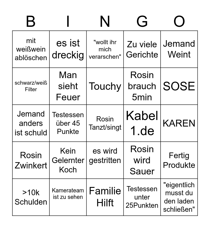 This bingo card has a free space and 24 words: Kein Gelernter Koch, Kamerateam ist zu sehen, Touchy, >10k Schulden, Jemand Weint, mit weißwein ablöschen, schwarz/weiß Filter, es ist dreckig, Kabel 1.de, es wird gestritten, Rosin brauch 5min, Jemand anders ist schuld, Rosin wird Sauer, Fertig Produkte, Man sieht Feuer, Testessen unter 25Punkten, KAREN, "wollt ihr mich verarschen", SOSE, Testessen über 45 Punkte, "eigentlich musst du den laden schließen", Rosin Zwinkert, Zu viele Gerichte and Familie Hilft.