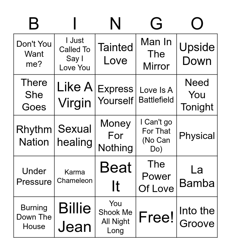 This bingo card has 30 words: Billie Jean, Call Me, Sexual healing, I Love Rock 'N' Roll, Don't You Want me?, Tainted Love, Like A Virgin, Beat It, I Can't go For That (No Can Do), You Shook Me All Night Long, Physical, Money For Nothing, Free!, Into the Groove, Need You Tonight, Time After Time, The Power Of Love, Under Pressure, Karma Chameleon, Upside Down, Rhythm Nation, Wicked Game, I Just Called To Say I Love You, Love Is A Battlefield, There She Goes, Man In The Mirror, La Bamba, Burning Down The House, Express Yourself and Down Under.