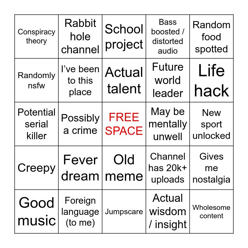 This bingo card has a free space and 24 words: Fever dream, Foreign language (to me), Actual talent, Good music, Random food spotted, Conspiracy theory, Randomly nsfw, Rabbit hole channel, May be mentally unwell, Old meme, Future world leader, Potential serial killer, Channel has 20k+ uploads, Gives me nostalgia, I’ve been to this place, Actual wisdom / insight, New sport unlocked, School project, Life hack, Possibly a crime, Wholesome content, Creepy, Bass boosted / distorted audio and Jumpscare.
