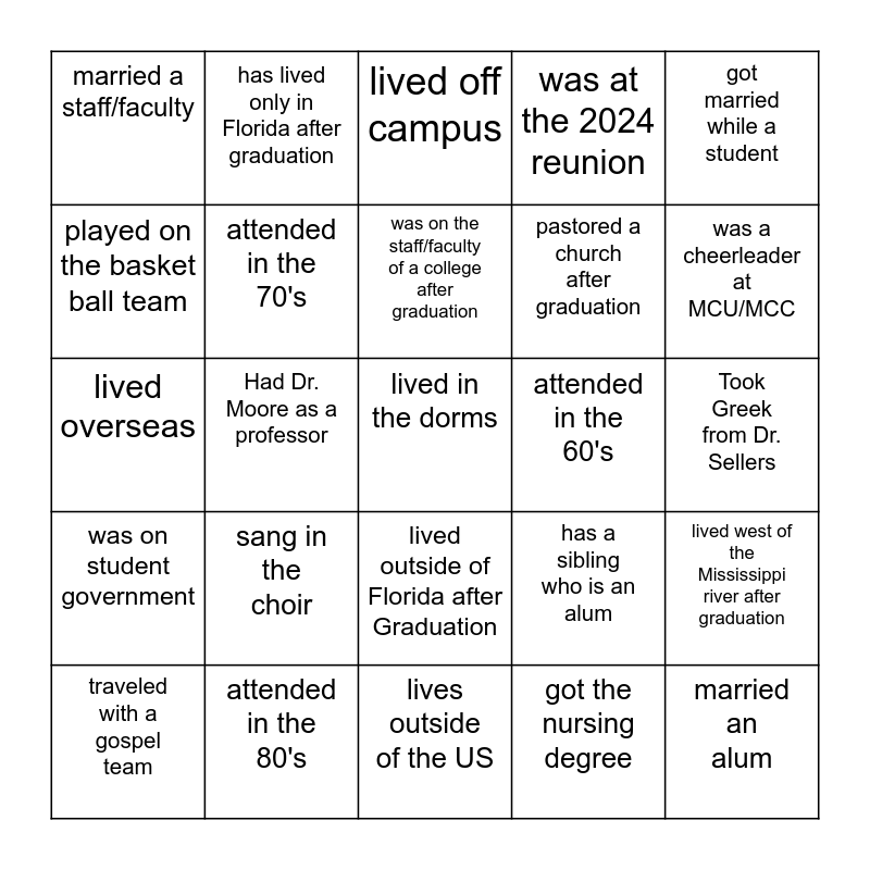 This bingo card has 25 words: sang in the choir, lives outside of the US, was on the staff/faculty of a college after graduation, traveled with a gospel team, got married while a student, married a staff/faculty, played on the basket ball team, has lived only in Florida after graduation, attended in the 60's, lived outside of Florida after Graduation, pastored a church after graduation, lived overseas, has a sibling who is an alum, lived west of the Mississippi river after graduation, attended in the 70's, married an alum, Took Greek from Dr. Sellers, lived off campus, was a cheerleader at MCU/MCC, Had Dr. Moore as a professor, lived in the dorms, attended in the 80's, was on student government, was at the 2024 reunion and got the nursing degree.