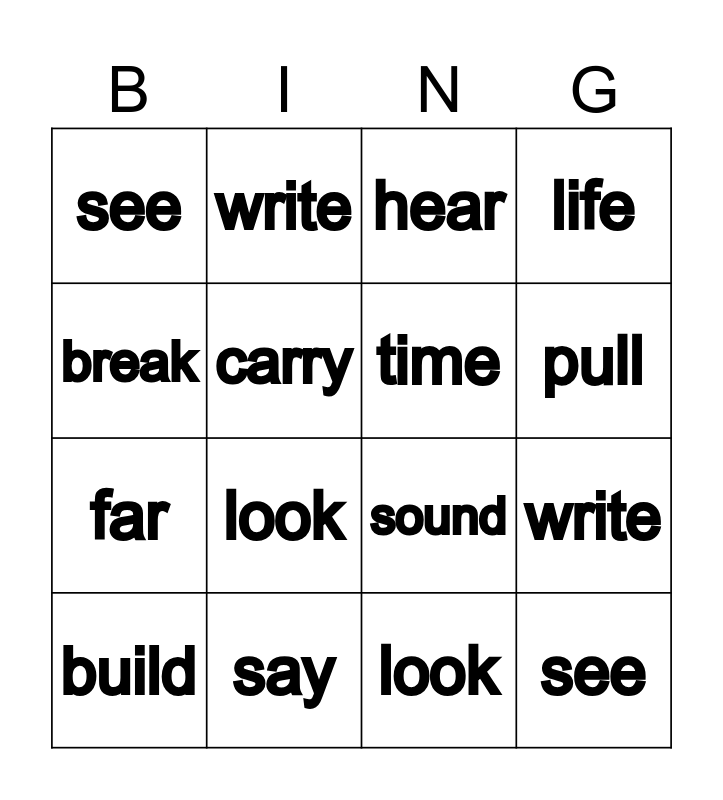 This bingo card has 16 words: say, write, hear, see, far, write, sound, look, break, carry, build, life, look, pull, time and see.