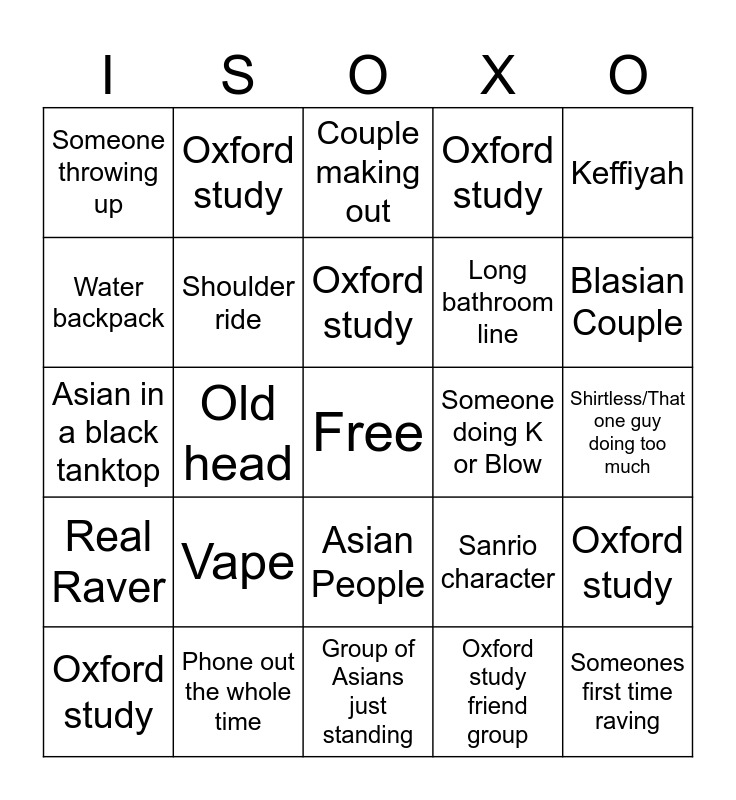 This bingo card has a free space and 29 words: Oxford study, Someone rolling, Old head, Black person, Someone throwing up, Couple making out, Shoulder ride, Vape, Someone doing K or Blow, Phone out the whole time, Shirtless/That one guy doing too much, Someones first time raving, Group of Asians just standing, Oxford study friend group, Blasian Couple, Fur boots, Asian People, Real Raver, Keffiyah, Asian in a black tanktop, Sanrio character, Smelling salt, Long bathroom line, Water backpack, Oxford study, Oxford study, Oxford study, Oxford study and Oxford study.