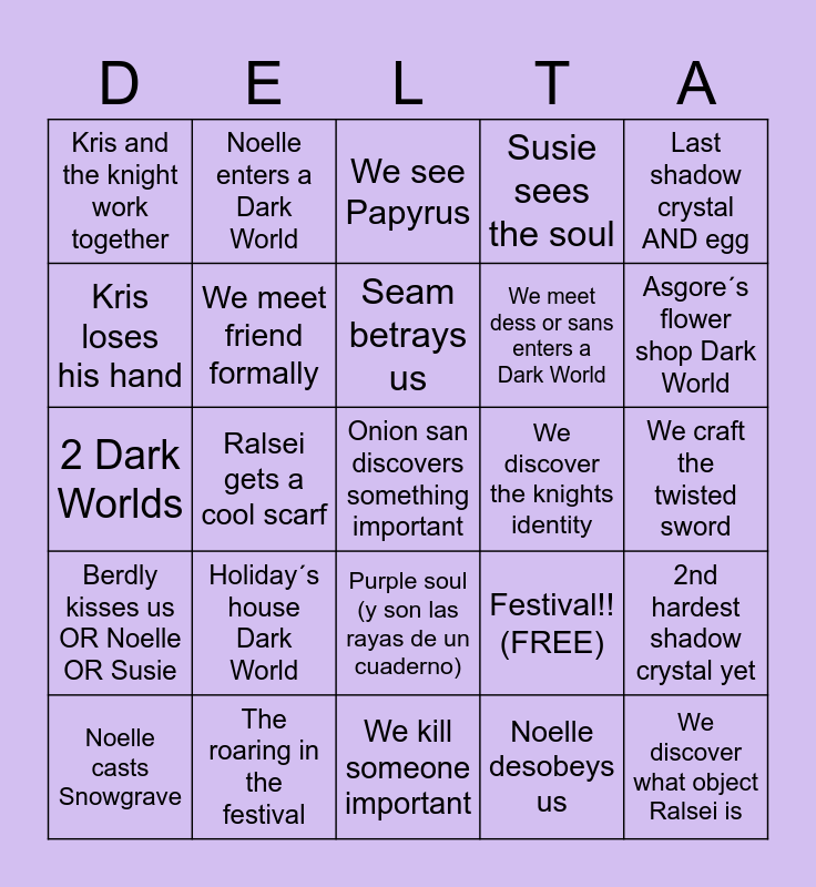 This bingo card has 25 words: Holiday´s house Dark World, We kill someone important, Seam betrays us, Noelle casts Snowgrave, Last shadow crystal AND egg, Kris and the knight work together, Kris loses his hand, Noelle enters a Dark World, We discover the knights identity, Purple soul (y son las rayas de un cuaderno), We meet dess or sans enters a Dark World, 2 Dark Worlds, Festival!! (FREE), 2nd hardest shadow crystal yet, We meet friend formally, We discover what object Ralsei is, We craft the twisted sword, We see Papyrus, Asgore´s flower shop Dark World, Ralsei gets a cool scarf, Onion san discovers something important, The roaring in the festival, Berdly kisses us OR Noelle OR Susie, Susie sees the soul and Noelle desobeys us.