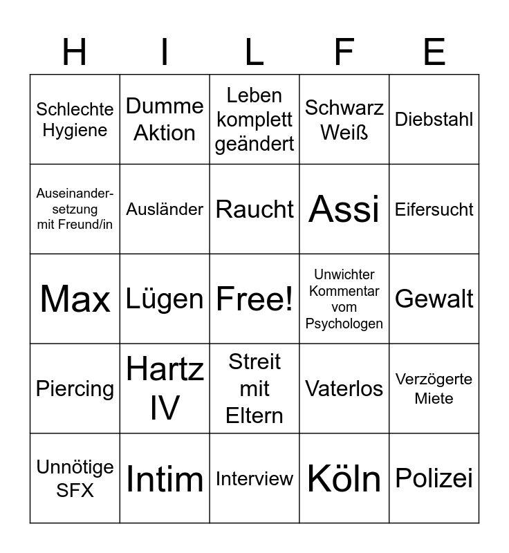 This bingo card has a free space and 24 words: Hartz IV, Intim, Raucht, Unnötige SFX, Diebstahl, Schlechte Hygiene, Auseinander- setzung mit Freund/in, Dumme Aktion, Unwichter Kommentar vom Psychologen, Streit mit Eltern, Assi, Max, Vaterlos, Verzögerte Miete, Ausländer, Köln, Gewalt, Leben komplett geändert, Eifersucht, Lügen, Polizei, Piercing, Schwarz Weiß and Interview.