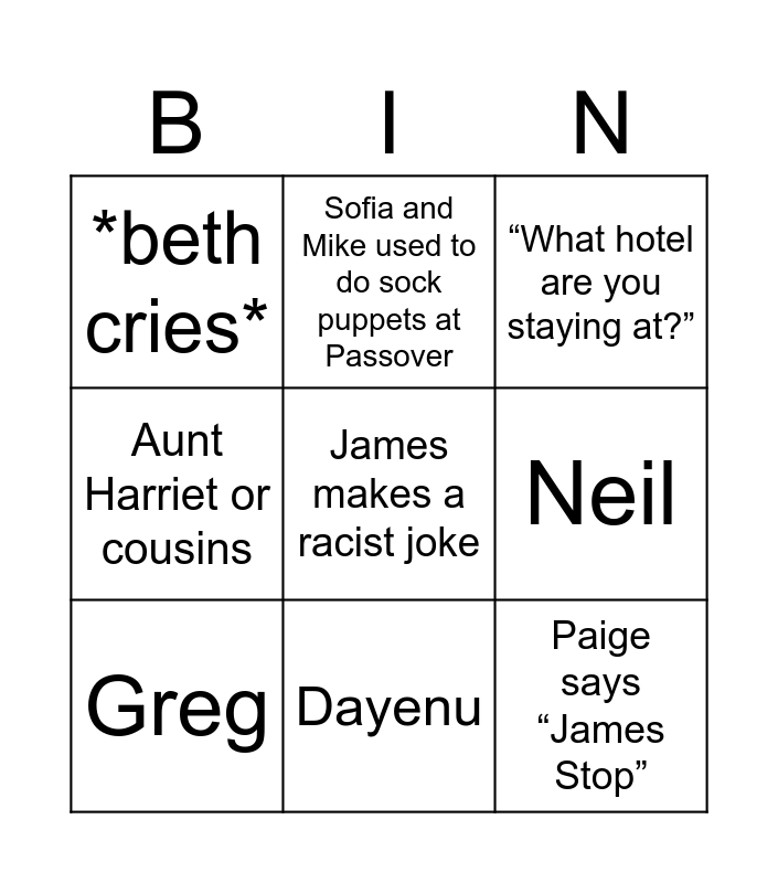 This bingo card has 17 words: Mamdani, Schvitsing, “What hotel are you staying at?”, *beth cries*, Dayenu, Neil, Ramps, James makes a racist joke, Paige says “James Stop”, Greg, Aunt Beth mentions Geno Smith and James/Dad say “who cares”, Sheepshead Bay Memory, Aunt Harriet or cousins, Sofia and Mike used to do sock puppets at Passover, Sheldon went to pay rent in the city, James gets fed up with wedding talk and Uncle Sheldon brings up how he texts sofia happy birthday.