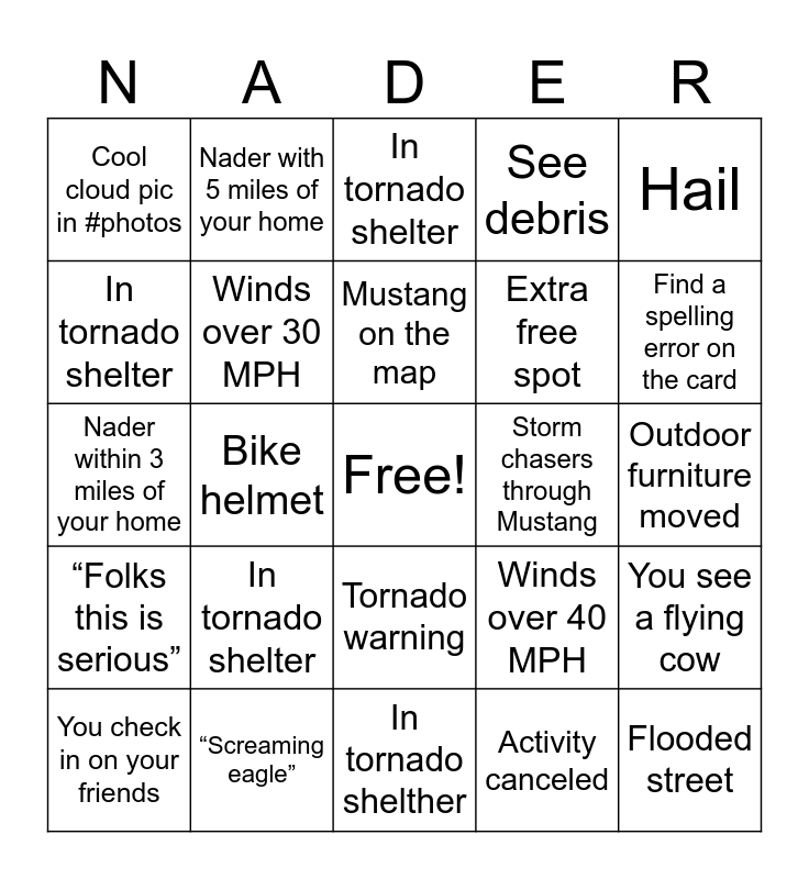 This bingo card has a free space and 24 words: In tornado shelter, “Screaming eagle”, Mustang on the map, You check in on your friends, Hail, Cool cloud pic in #photos, In tornado shelter, Nader with 5 miles of your home, Storm chasers through Mustang, Tornado warning, Extra free spot, Nader within 3 miles of your home, Winds over 40 MPH, You see a flying cow, Winds over 30 MPH, Activity canceled, Outdoor furniture moved, In tornado shelter, Find a spelling error on the card, Bike helmet, Flooded street, “Folks this is serious”, See debris and In tornado shelther.