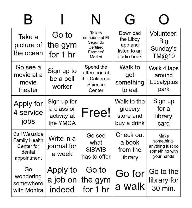 This bingo card has a free space and 40 words: Go to the library for 30 min., Apply for 4 service jobs, Apply for 3 jobs, Sign up to be a poll worker, Apply to a job on indeed, Go see what SIBWIB has to offer, Spend the afternoon at the California Science Center, Apply to a job on indeed, Volunteer: Big Sunday’s TM@10, Call Westside Family Health Center for dental appointment, Sign up for a class or activity at the YMCA, Download the Libby app and listen to an audio book, Go to the library for 30 min., Sign up for a library card, Walk to the grocery store and buy a drink, Write in a journal for a week, Apply for LIFE bus pass, Take a picture of the ocean, Go to the El Segundo Certified Farmers' Market, Talk to someone at El Segundo Certified Farmers' Market, Make something- anything just do something with your hands, Go for a walk, Walk to get something to eat, Go see a movie at a movie theater, Go to the gym for 1 hr, Clean section of your room, Clean the bathroom, Wash the dishes, Sign up and try Habitica, Watch a documentary, Learn something new, Go wondering somewhere with Montra, Play a board game with Jr., Check out a book from the library, Walk 4 laps around Eucalyptus park, Go to the gym for 1 hr, Volunteer: Big Sunday’s TM@10, Go to the gym for 1 hr, Go to the gym for 1 hr and Sign up for the Libby app.