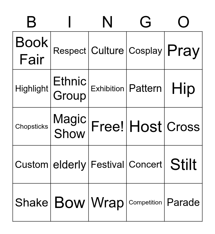 This bingo card has a free space and 24 words: elderly, Bow, Exhibition, Shake, Pray, Book Fair, Highlight, Respect, Host, Festival, Pattern, Chopsticks, Concert, Stilt, Ethnic Group, Competition, Cross, Culture, Hip, Magic Show, Parade, Custom, Cosplay and Wrap.