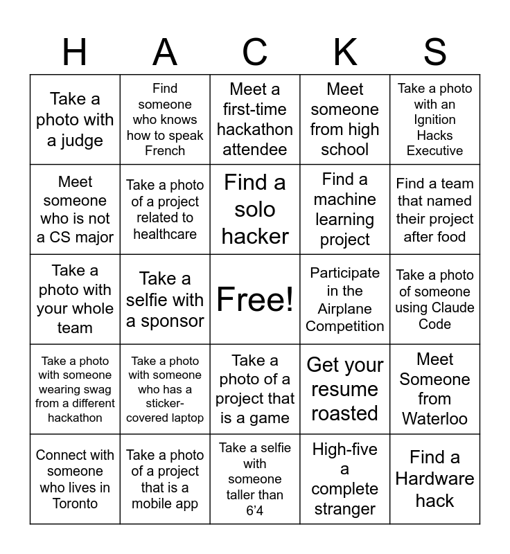 This bingo card has a free space and 24 words: Take a photo with someone who has a sticker-covered laptop, Take a photo of a project that is a mobile app, Find a solo hacker, Connect with someone who lives in Toronto, Take a photo with an Ignition Hacks Executive, Take a photo with a judge, Meet someone who is not a CS major, Find someone who knows how to speak French, Participate in the Airplane Competition, Take a photo of a project that is a game, Find a machine learning project, Take a photo with your whole team, Get your resume roasted, Meet Someone from Waterloo, Take a photo of a project related to healthcare, High-five a complete stranger, Take a photo of someone using Claude Code, Meet a first-time hackathon attendee, Find a team that named their project after food, Take a selfie with a sponsor, Find a Hardware hack, Take a photo with someone wearing swag from a different hackathon, Meet someone from high school and Take a selfie with someone taller than 6’4.