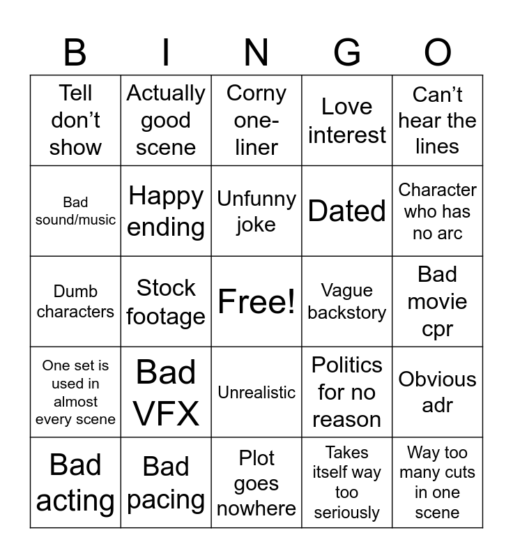This bingo card has a free space and 24 words: Bad VFX, Bad pacing, Unfunny joke, Bad acting, Can’t hear the lines, Tell don’t show, Bad sound/music, Actually good scene, Vague backstory, Unrealistic, Dated, Dumb characters, Politics for no reason, Obvious adr, Happy ending, Takes itself way too seriously, Bad movie cpr, Corny one-liner, Character who has no arc, Stock footage, Way too many cuts in one scene, One set is used in almost every scene, Love interest and Plot goes nowhere.