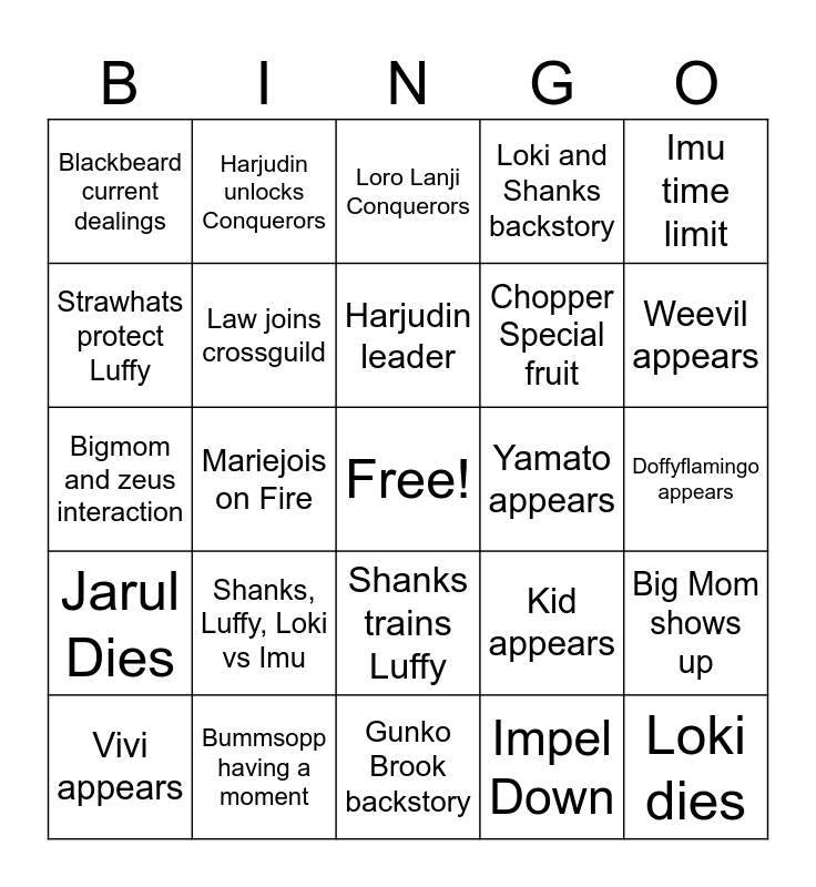 This bingo card has a free space and 24 words: Shanks, Luffy, Loki vs Imu, Bummsopp having a moment, Harjudin leader, Vivi appears, Imu time limit, Blackbeard current dealings, Strawhats protect Luffy, Harjudin unlocks Conquerors, Yamato appears, Shanks trains Luffy, Chopper Special fruit, Bigmom and zeus interaction, Kid appears, Big Mom shows up, Law joins crossguild, Impel Down, Doffyflamingo appears, Loro Lanji Conquerors, Weevil appears, Mariejois on Fire, Loki dies, Jarul Dies, Loki and Shanks backstory and Gunko Brook backstory.