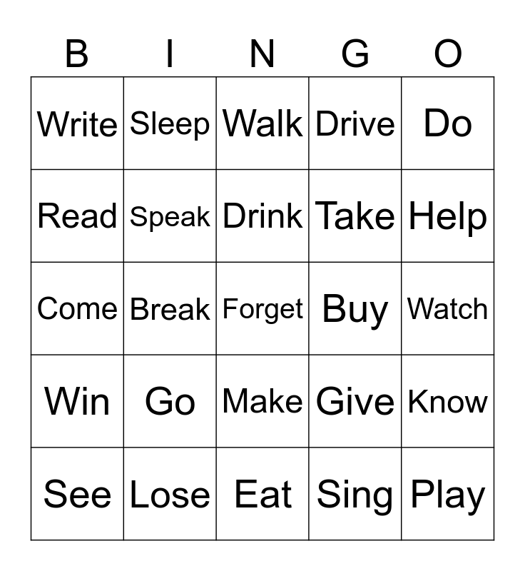 This bingo card has 25 words: Go, Eat, Drink, See, Do, Write, Read, Sleep, Buy, Make, Take, Come, Give, Know, Speak, Play, Watch, Walk, Help, Break, Forget, Lose, Win, Drive and Sing.