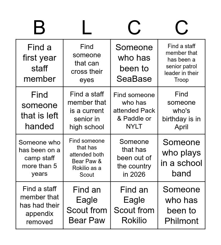 This bingo card has 16 words: Find an Eagle Scout from Bear Paw, Someone who plays in a school band, Someone who has been to SeaBase, Find a first year staff member, Someone who has been on a camp staff more than 5 years, Find someone that can cross their eyes, Someone that has been out of the country in 2026, Find an Eagle Scout from Rokilio, Find someone that is left handed, Find a staff member that is a current senior in high school, Find a staff member that has had their appendix removed, Find a staff member that has been a senior patrol leader in their Troop, Find someone that has attended both Bear Paw & Rokilio as a Scout, Find someone who's birthday is in April, Find someone who has attended Pack & Paddle or NYLT and Someone who has been to Philmont.