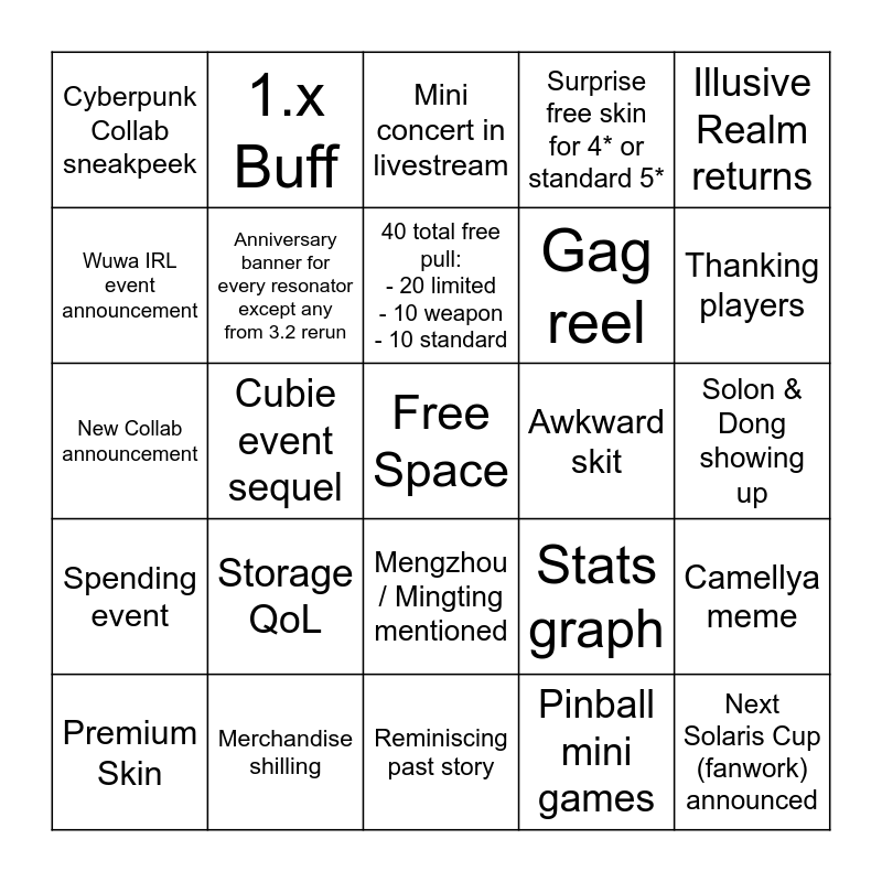 This bingo card has a free space and 24 words: Premium Skin, Storage QoL, 40 total free pull: - 20 limited - 10 weapon - 10 standard, Pinball mini games, Illusive Realm returns, Cyberpunk Collab sneakpeek, 1.x Buff, Mini concert in livestream, Awkward skit, Solon & Dong showing up, New Collab announcement, Anniversary banner for every resonator except any from 3.2 rerun, Stats graph, Camellya meme, Wuwa IRL event announcement, Merchandise shilling, Reminiscing past story, Surprise free skin for 4* or standard 5*, Thanking players, Spending event, Cubie event sequel, Mengzhou / Mingting mentioned, Gag reel and Next Solaris Cup (fanwork) announced.