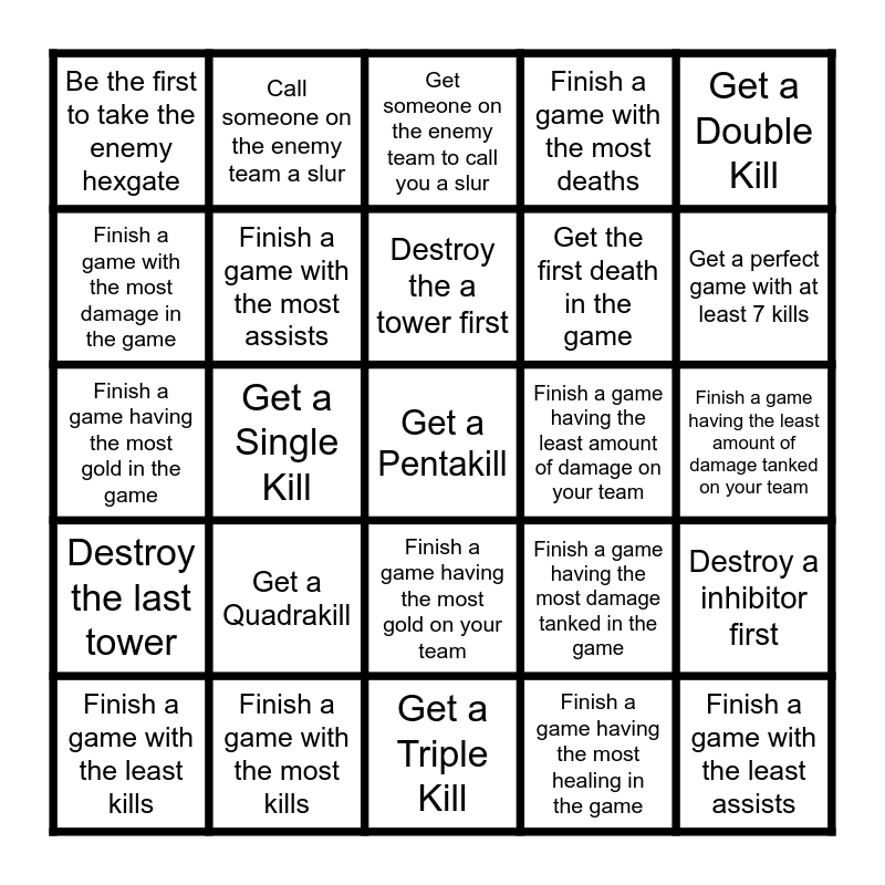 This bingo card has a free space and 24 words: Get a Quadrakill, Finish a game with the most kills, Destroy the a tower first, Finish a game with the least kills, Get a Double Kill, Be the first to take the enemy hexgate, Finish a game with the most damage in the game, Call someone on the enemy team a slur, Finish a game having the least amount of damage on your team, Finish a game having the most gold on your team, Get the first death in the game, Finish a game having the most gold in the game, Finish a game having the most damage tanked in the game, Destroy a inhibitor first, Finish a game with the most assists, Finish a game having the most healing in the game, Finish a game having the least amount of damage tanked on your team, Get someone on the enemy team to call you a slur, Get a perfect game with at least 7 kills, Get a Single Kill, Finish a game with the least assists, Destroy the last tower, Finish a game with the most deaths and Get a Triple Kill.