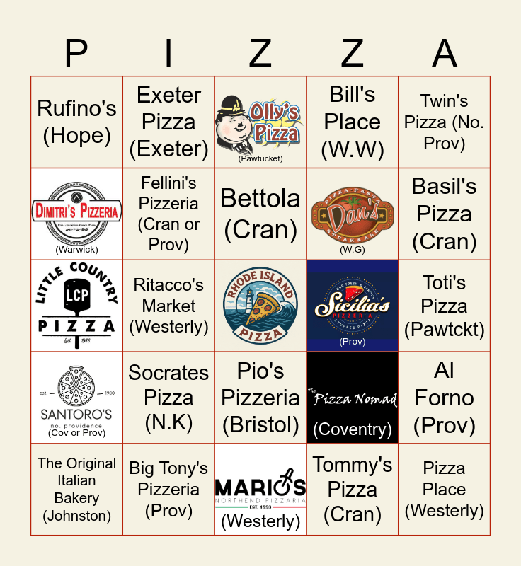 This bingo card has 10 images, a free space and 26 words: (Coventry), (E.G), (W.G), (Westerly), (Warwick), (Pawtucket), Exeter Pizza (Exeter), (Cov or Prov), (Prov), Al Forno (Prov), Bill's Place (W.W), The Original Italian Bakery (Johnston), Big Tony's Pizzeria (Prov), Basil's Pizza (Cran), Casa Della Luce (Westerly), Fellini's Pizzeria (Cran or Prov), Bettola (Cran), Socrates Pizza (N.K), Rufino's (Hope), Toti's Pizza (Pawtckt), Tommy's Pizza (Cran), Ritacco's Market (Westerly), Pizza Place (Westerly), Pio's Pizzeria (Bristol), Twin's Pizza (No. Prov) and (Prov).