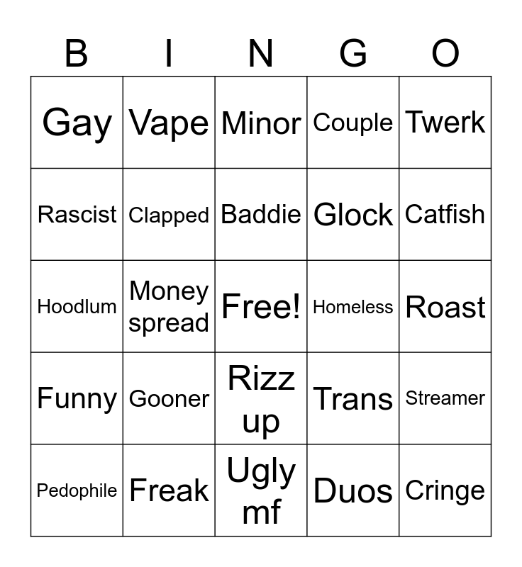 This bingo card has a free space and 24 words: Gooner, Freak, Baddie, Pedophile, Twerk, Gay, Rascist, Vape, Homeless, Rizz up, Glock, Hoodlum, Trans, Streamer, Clapped, Duos, Roast, Minor, Catfish, Money spread, Cringe, Funny, Couple and Ugly mf.
