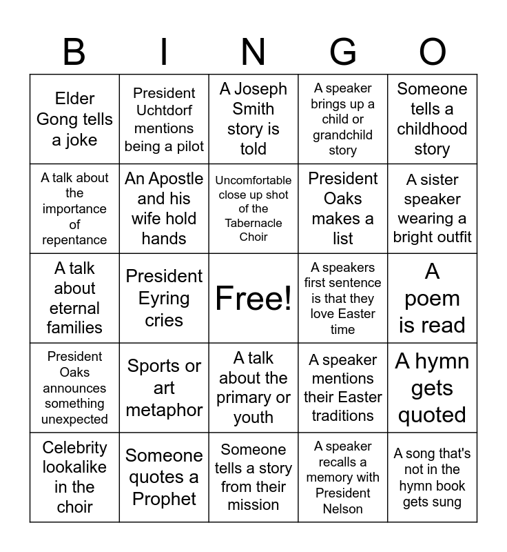 This bingo card has a free space and 24 words: Sports or art metaphor, Someone quotes a Prophet, Uncomfortable close up shot of the Tabernacle Choir, Celebrity lookalike in the choir, Someone tells a childhood story, Elder Gong tells a joke, A talk about the importance of repentance, President Uchtdorf mentions being a pilot, A speakers first sentence is that they love Easter time, A talk about the primary or youth, President Oaks makes a list, A talk about eternal families, A speaker mentions their Easter traditions, A hymn gets quoted, An Apostle and his wife hold hands, A speaker recalls a memory with President Nelson, A poem is read, A Joseph Smith story is told, A sister speaker wearing a bright outfit, President Eyring cries, A song that's not in the hymn book gets sung, President Oaks announces something unexpected, A speaker brings up a child or grandchild story and Someone tells a story from their mission.