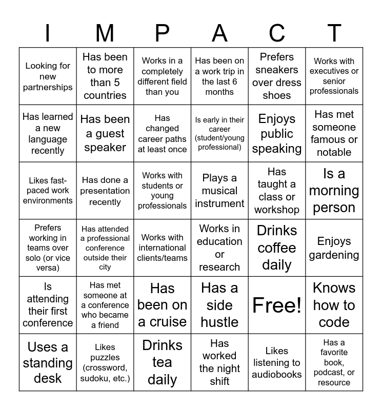 This bingo card has 37 words: Free!, Has a side hustle, Likes listening to audiobooks, Has learned a new language recently, Has attended a professional conference outside their city, Has taught a class or workshop, Has been a guest speaker, Has worked the night shift, Prefers sneakers over dress shoes, Uses a standing desk, Has met someone famous or notable, Has been on a work trip in the last 6 months, Likes fast-paced work environments, Works with students or young professionals, Works with executives or senior professionals, Plays a musical instrument, Has met someone at a conference who became a friend, Works in a completely different field than you, Is a morning person, Has done a presentation recently, Looking for new partnerships, Is early in their career (student/young professional), Works with international clients/teams, Drinks coffee daily, Likes puzzles (crossword, sudoku, etc.), Enjoys gardening, Has been to more than 5 countries, Drinks tea daily, Knows how to code, Has been on a cruise, Rides public transportation, Works in education or research, Enjoys public speaking, Is attending their first conference, Prefers working in teams over solo (or vice versa), Has changed career paths at least once and Has a favorite book, podcast, or resource.