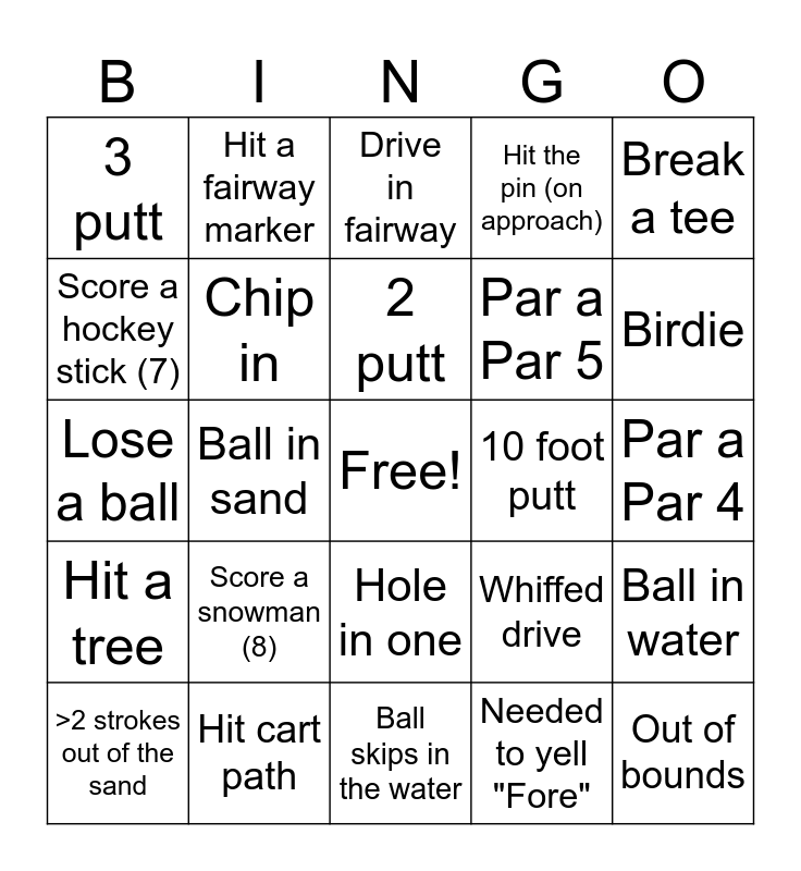 This bingo card has a free space and 30 words: Hit cart path, Find a ball, Ball in sand, Bogey, 3 putt, Drive in fairway, Chip in, Hole in one, 10 foot putt, Ball skips in the water, Par a Par 4, Out of bounds, Needed to yell "Fore", Lip out, Birdie, Par a Par 3, Whiffed drive, Hit a tree, Score a snowman (8), Break a tee, Lose a ball, Putt from the fringe, Hit a fairway marker, Par a Par 5, Score a hockey stick (7), Hit the pin (on approach), Ball in water, >2 strokes out of the sand, 2 putt and Double Bogey.