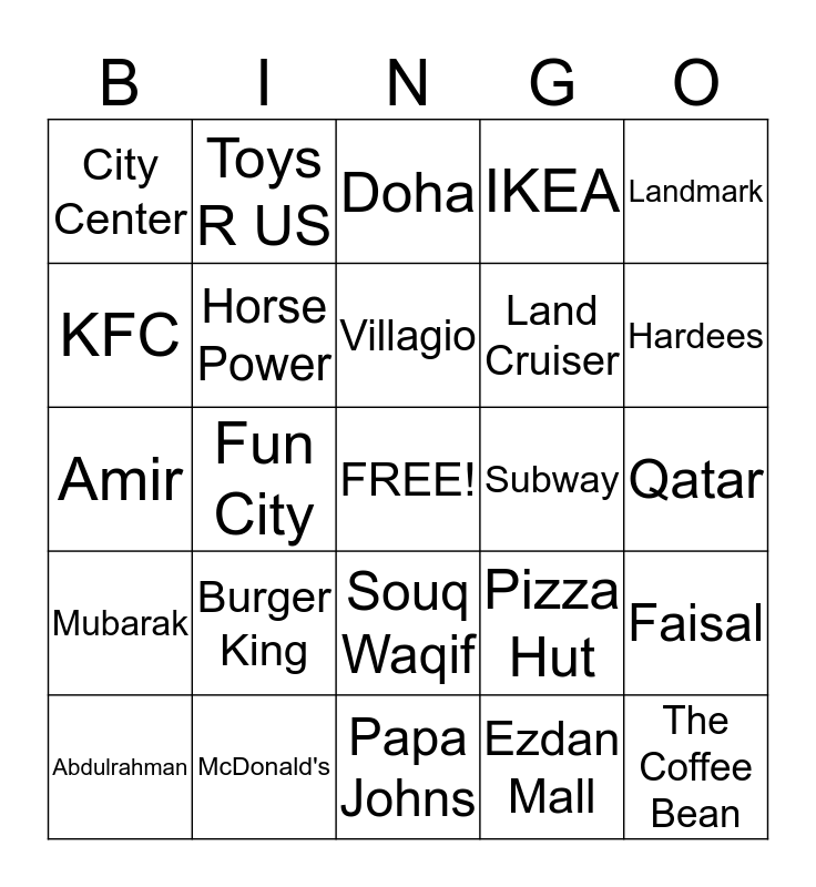 This bingo card has a free space and 24 words: Burger King, McDonald's, Villagio, Abdulrahman, Landmark, City Center, KFC, Toys R US, Subway, Souq Waqif, Land Cruiser, Amir, Pizza Hut, Faisal, Horse Power, Ezdan Mall, Qatar, Doha, Hardees, Fun City, The Coffee Bean, Mubarak, IKEA and Papa Johns.